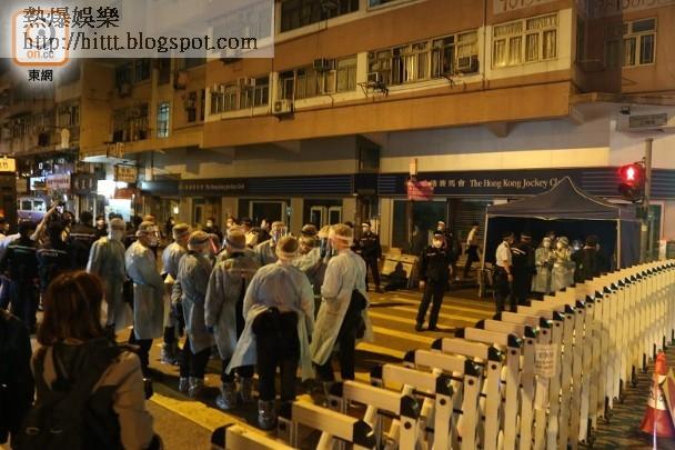 大批全副保護裝備的人員,在封鎖區內作好準備,替受檢人士採樣檢測。(胡德威攝)