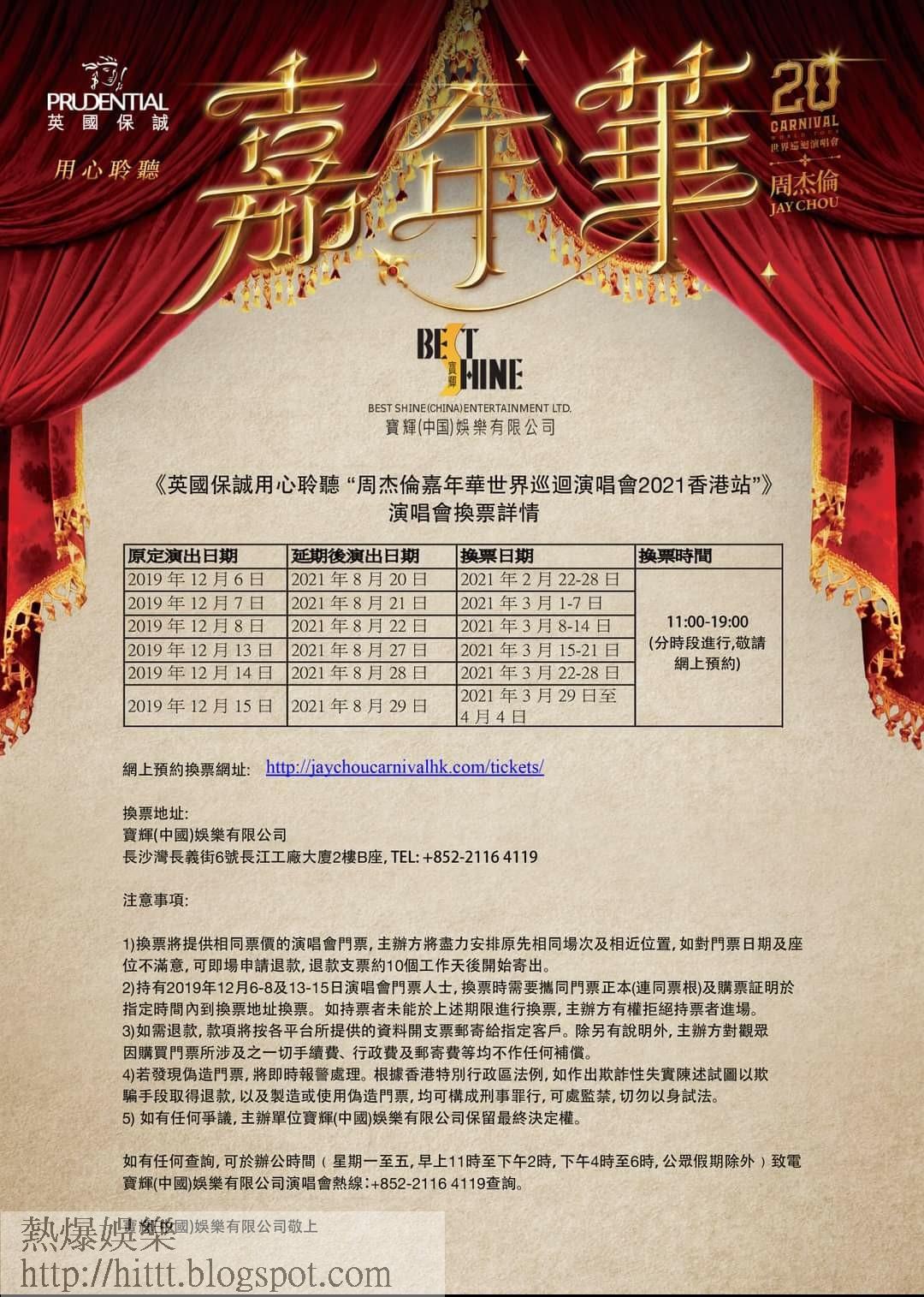 周杰倫原定前年12月假香港迪士尼舉行6場《周杰倫嘉年華世界巡迴演唱會2019香港站》,但因受到社會運動及武漢肺炎疫情影響,早前主辦單位寶輝娛樂宣佈將演唱會延期至今年4月假中環海濱活動空間舉行。可惜面對香港爆發疫情第4波,主辦單位今日宣佈再度延期,舉行日子將會是8月20、21、22、27、28及29日,地點繼續是中環海濱活動空間,已購票的觀眾,可依照主辦單位官方網站安排,於本月15日開始進行換票。