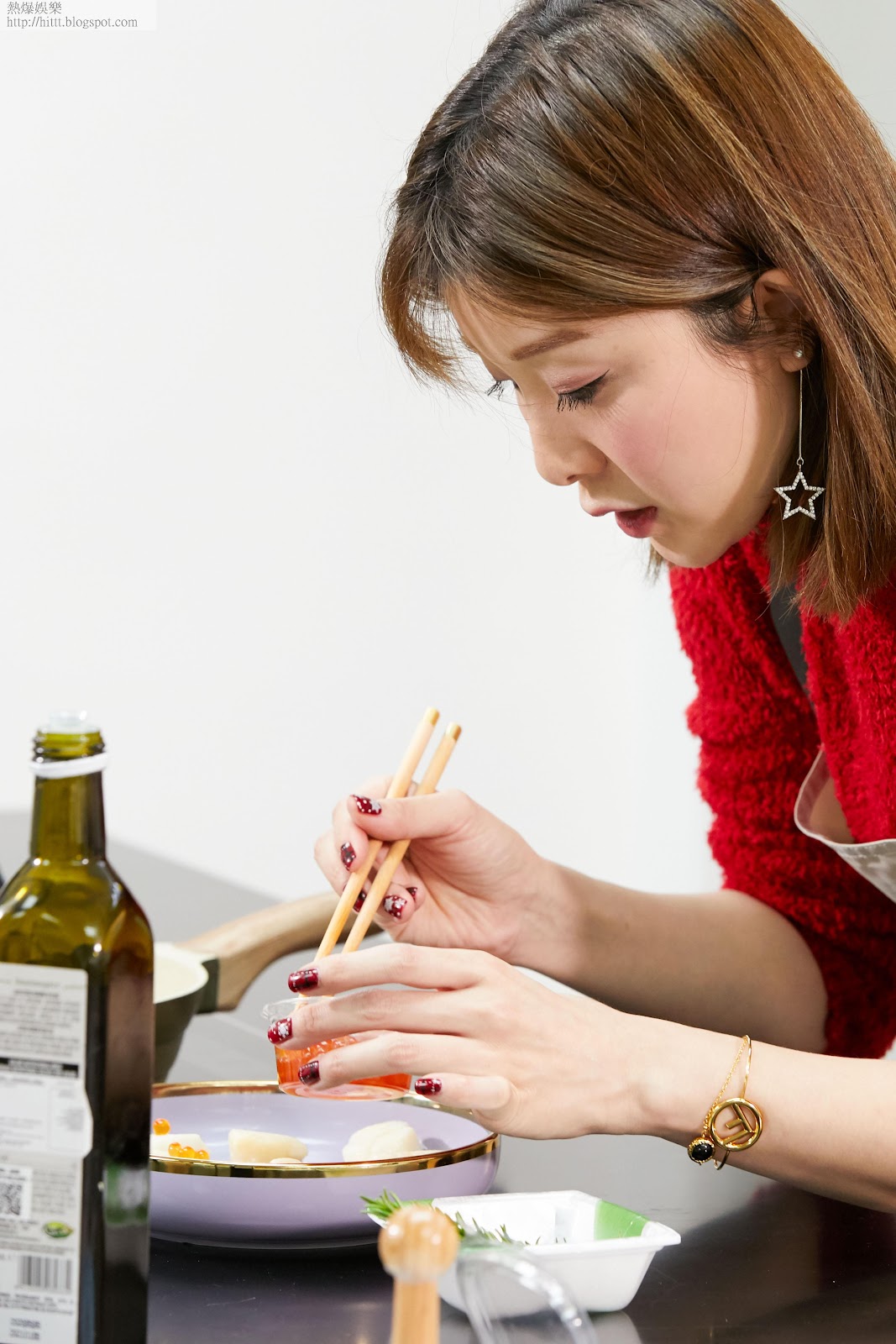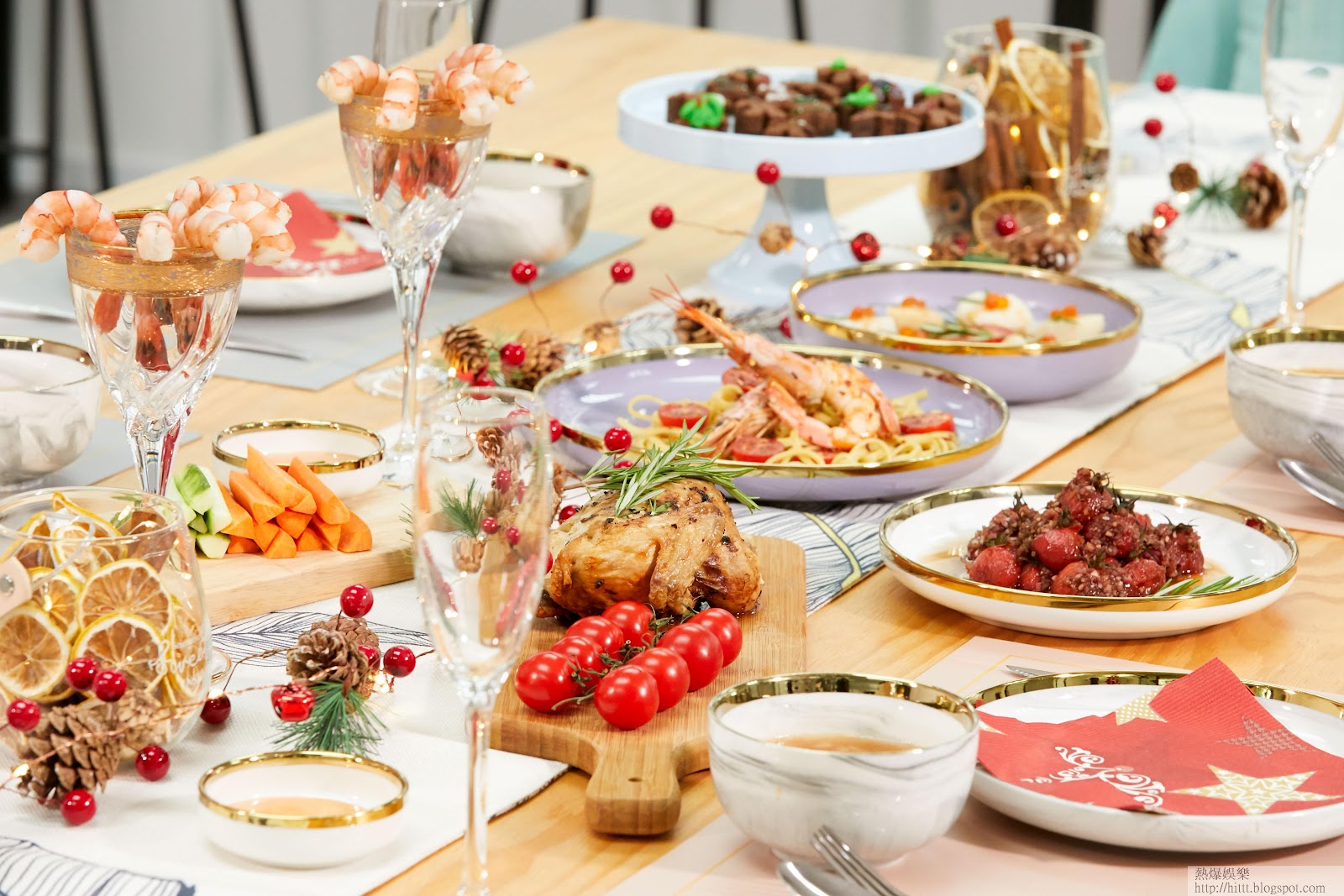 她今次泡製四人親子餐,示範其中頭盤及主菜。餐單以自家湯包配三款海鮮頭盤,「唔敢講教人,大家分享煮食樂。頭盤嘅帶子只需要煎三、四成熟就得,因為本身係刺身,同埋要保持帶子形狀。」兩款主菜:紅蝦意粉及燒春雞,花費時間亦不多,「意粉記得要用扁意粉,先要整一個好濃嘅紅蝦湯湯底做汁,十幾廿隻紅蝦蝦頭煎香,再加少少水、紅酒、鹽、糖,煮半個鐘頭左右。紅蝦湯本身可比美龍蝦湯濃郁,但少咗一分苦澀味。烤春雞今次就用氣炸方法做,快啲,秘訣之一係將雞肉同皮分開,將醃料牛油塞入去,呢個動作目的係令到雞肉嫩滑,而氣炸時,雞皮又脆,氣炸鍋預熱200度,之後每邊十分鐘就得。」最後和女兒一齊親子製作無麩質全素布朗尼,以預製拌粉製作簡易版。