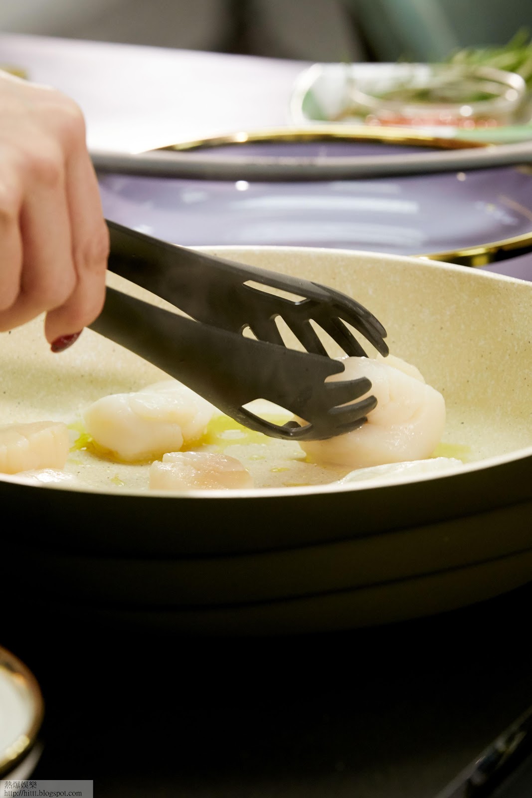 2 橄欖油熱鑊煎帶子,轉中細火,煎至金黃色上碟