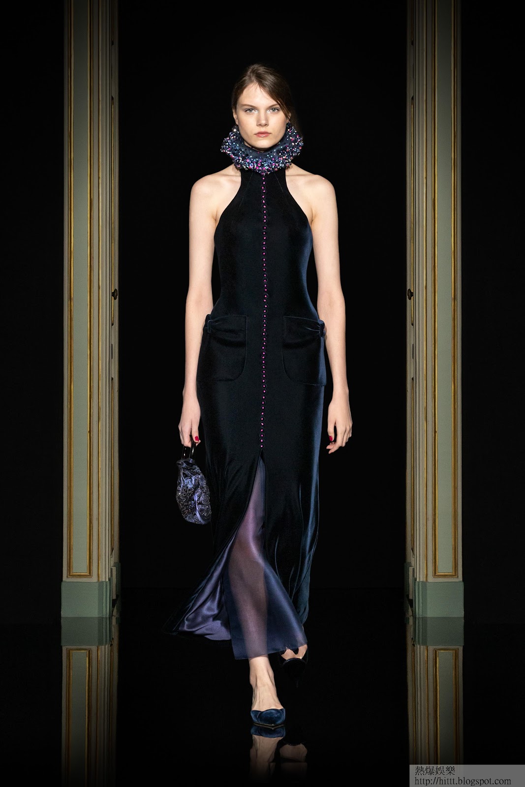 Armani筆下的女士,向來都是亦剛亦柔,自信而美麗。春夏高訂一開場先有品牌經典的套裝剪裁,搭配閃爍的金銀絲織面料,幹練中蘊含一絲溫柔;以天鵝絨、錦缎及水洗真絲等製成的禮服,在荷葉邊及喱士細節襯托下時而知性優雅,時而慵懶迷人。今季的晚裝主打洋紅色、水綠色及普魯士藍(Prussian blue)色調,飄逸流動的輪廓線條與裁剪比例讓人眼前一亮,刺繡、水晶鑲飾、亮片等細膩工藝將設計昇華;薄紗掩映的透視裙浪漫輕盈,裙上的花卉及蝴蝶刺繡與色彩巧妙地融為一體,交織出夢幻氛圍,勾勒女性千變迷人的一面。最後一套登場的Klein Blue晚裝更是Mr. Giorgio Armani的野心之作,將長130米薄紗直接經過皺褶和熨燙,產生出樹皮般的視覺質感,展現工匠技藝的巔峰。
