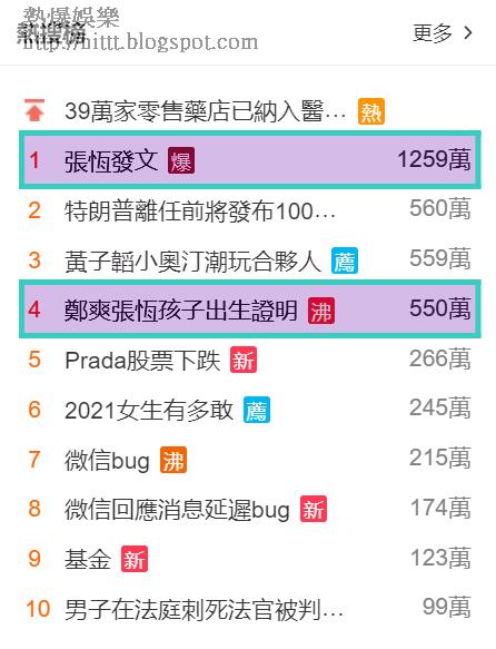而張恒的post更一度成為今日微博熱門搜尋,鄭爽與張恒一對子女的出生證明亦打入十大位置。惟鄭爽至今仍潛水,未作回應。