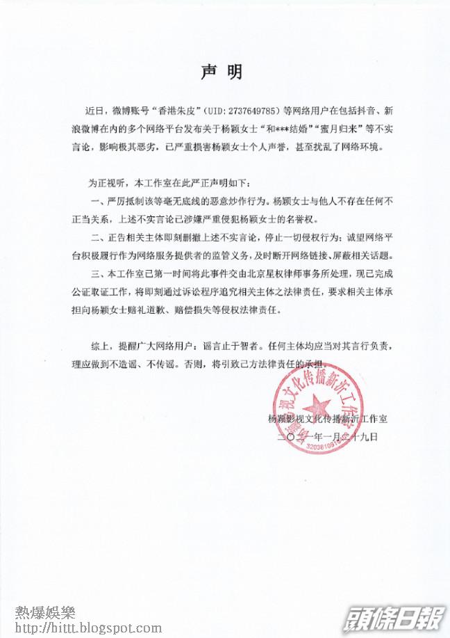 對於改嫁傳聞,Baby透過工作室發聲明否認,強調「楊穎女士與他人不存在任何不正當關係,上述不實言論已涉嫌嚴重損害楊穎女士的名譽權。」嚴厲痛斥造謠者是惡意炒作,及將事件交由律師處理,並已完成公證取證的程序,將通過訴訟程序追究責任。