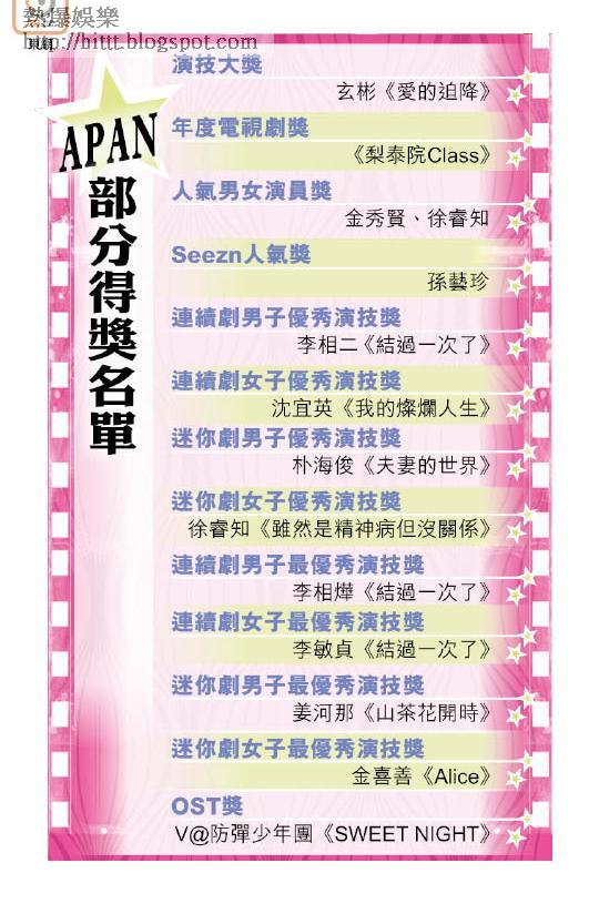 韓國年度盛事《2020 APAN Awards》分為「Star Awards」及「Music Awards」兩部分,原定去年11月28、29日舉行,但因疫情而押後,當中「STAR Awards」昨晚率先在韓國透過網上收費平台播出,並以錄播形式進行,沒招待觀眾入場,頒獎嘉賓亦只透過影片宣布賽果。