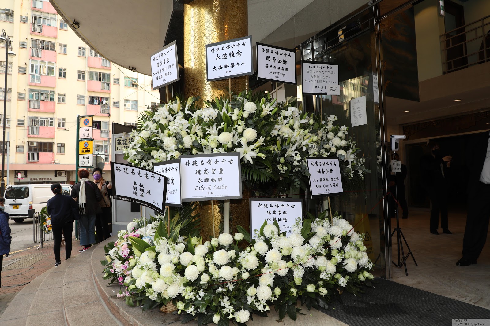 大名娛樂老闆林建名今日在香港殯儀館舉行追思會,一班藝人送上花牌致哀。
