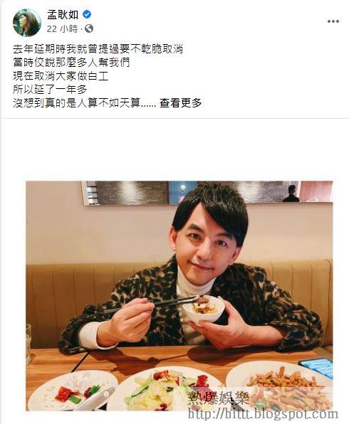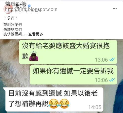 台灣名主持黃子佼和演員孟耿如去年3月註冊結婚,原定去年4月19日舉行婚宴,卻因為武漢肺炎肆虐,決定延期至今年5月16日再擺酒。但全球疫情不減反延燒,黃子佼夫婦昨日在社交平台宣佈第二度取消婚宴,他表示取消婚宴是為了保護別人也保護自己,基於各種不可預測的因素,夫妻倆最終忍痛下此決定。