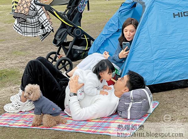 不過,在屋內紮營似乎不夠好玩。日前約中午一時,本刊就發現,架着墨鏡的展鵬,拖着單文柔,抱着「小豬比」,同行還有十歲大的狗仔包包,一家人在西九海濱長廊紮營。當日天朗氣清,雖然路人都對這位「視帝」行注目禮,但眼中只有妻女的展鵬,一於少理,並放下藝人的身段,席地而躺。期間,他抱着囡囡,並細心地向她講解公園內的各種事物;而小狗與「小豬比」亦打成一片,在草地上追逐。在旁的展鵬,極有耐性地做「跟得爸爸」,一直尾隨囡囡,留意她有沒有跌倒。