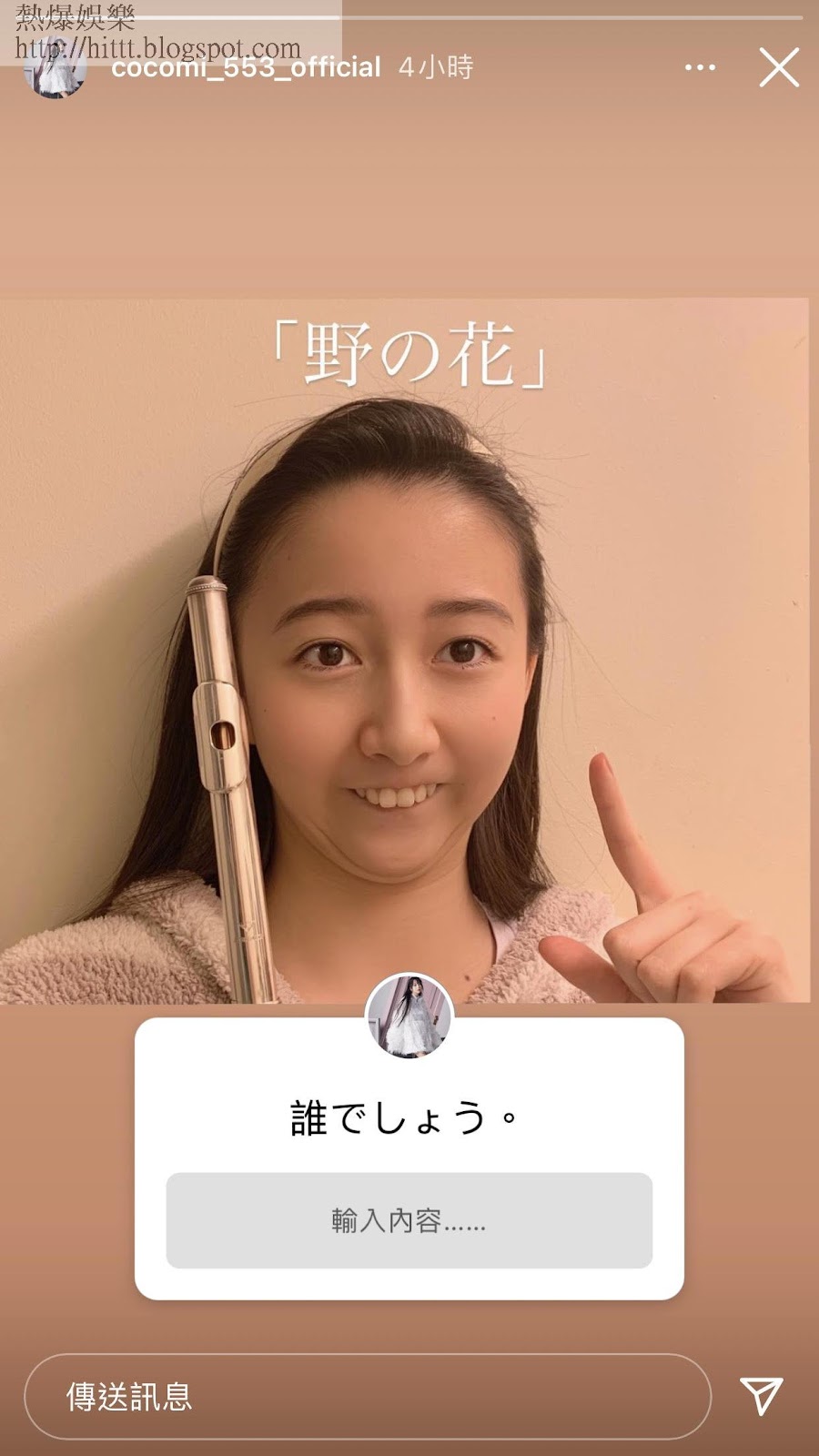 心美甫出道即獲各大品牌睇中,與妹妹光希同屬潮流界寵兒,近日心美就登上時尚刊物封面,兩姊妹的風頭不分上下。心美近期活躍社交網,昨日她公開拿長笛的鬼臉照片,扮哨牙兼裝出雙下巴,向網民開題問究竟扮邊個,過了20小時後她終於開估,亦有心水清網民估到她是在扮長青動漫《全職獵人》(HUNTER×HUNTER)的角色旋律。