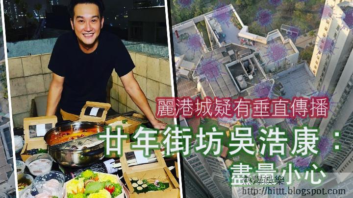 武漢肺炎肆虐,今日凌晨才解封佐敦封鎖區,但近日在藍田麗港城5座卻有多宗確診個案,今早港大微生物學系講座教授袁國勇到場視察後,懷疑麗港城5座有垂直傳播情況,建議將大廈E單位所有居民撤離。歌手吳浩康居於麗港城,他接受《蘋果》訪問時坦言擔心,除工作以外盡量少出街。