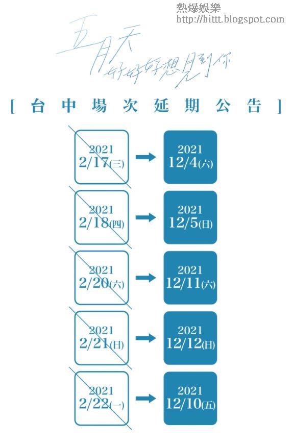 另外,將於2月中在台中舉行5場演唱會的樂隊五月天,宣佈延期至12月4、5、11、12、10日,買了飛的歌迷可以依更改後的日期到場又或是申請退票。