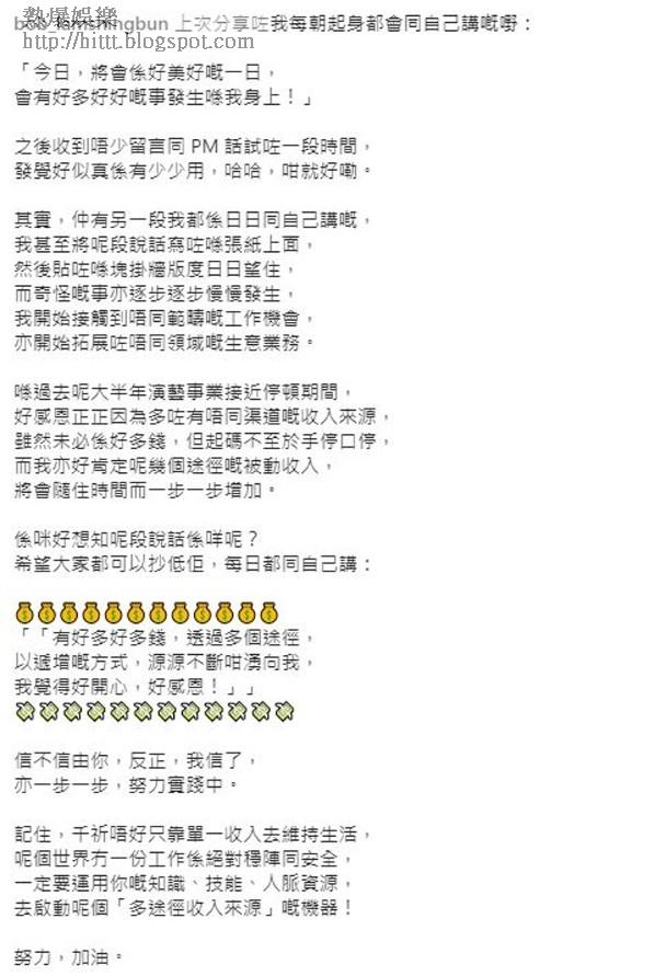 而呢段說話就係:「有好多好多錢,透過多個途徑,以遞增嘅方式,源源不斷咁湧向我,我覺得好開心,好感恩!」佢又提醒大家:「千祈唔好只靠單一收入去維持生活,呢個世界冇一份工作係絕對穩陣同安全,一定要運用你嘅知識、技能、人脈資源,去啟動呢個『多途徑收入來源』嘅機器!」