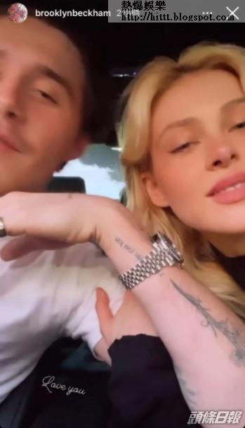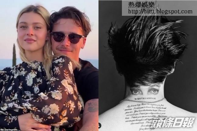 碧咸的21歲大仔Brooklyn Beckham經常與影星未婚妻妮歌娜佩絲(Nicola Peltz)放閃,他之前已為未婚妻在後頸紋上女方雙眼,今日他再公開新紋身,在雙眼紋身下紋上妮歌娜寫給他的情信,寫上︰「我永遠的男孩,當你感到憂慮的時候就讀這封信,我想讓你知道你有多麼被愛着。你有一顆我從未遇過最仁慈的心,我希望沒有一日得不到你的愛。我認為你十分非凡,如果你放慢呼吸和信任我,我們可以一同克服所有事情,我永遠愛你。」