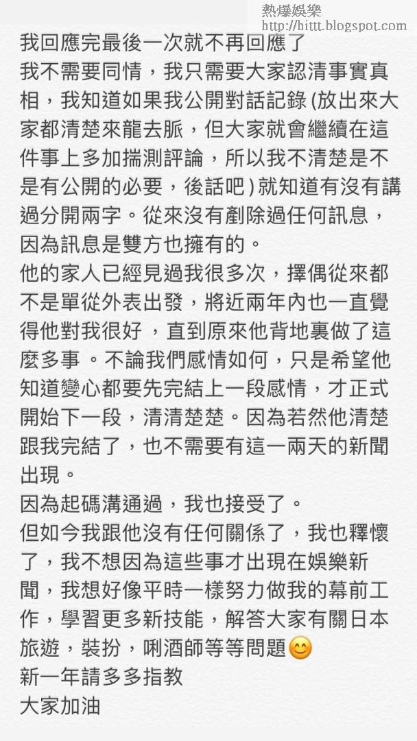 而Carrie其後又喺社交網發文,再度暗示有人一腳踏兩船,更指依家同男方冇關係,作出呢次回應後,就唔會再講:「不論我們感情如何,只是希望他知道變心都要完結上1段感情,才正式開始下1段,清清楚楚。因為若然他清楚跟我完結了,也不需要有這一兩天的新聞。因為起碼溝通,我也接受了。但如今我跟他沒有任何關係了,我也釋懷了,我不想因為這些事才出現在娛樂新聞,我想好像平時一樣努力做我的幕前工作。」