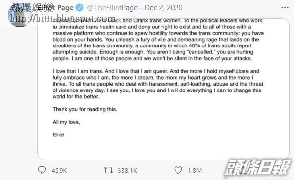 曾參演電影《Juno少女孕記》(Juno)、《潛行凶間》(Inception)的加拿大女星Ellen Page自14年公開出櫃後,18年宣布與舞蹈員妻子Emma Portner結婚,上月更宣布成為跨性別人士,改名為Elliot Page。當時Elliot獲妻子全力支持,不過今日傳出兩人昨日在紐約法院申請離婚,結束3年婚姻。