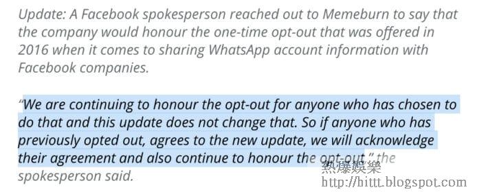 WhatsApp 在上週四向用戶發出通知時,已經表明歐盟國家和英國的用戶可以豁免於他們的私隱條款更新,就算歐洲用戶點選了同意,他們的資料亦不會跟 Facebook 分享。至於另一類能夠豁免的,則包括部份帳號在 2016 年 9 月之前註冊的用戶,只要他們在 2016 年 8 月時曾經選擇不與 Facebook 分享個人資料,WhatsApp 今次的私隱條款更新就不會影響他們。