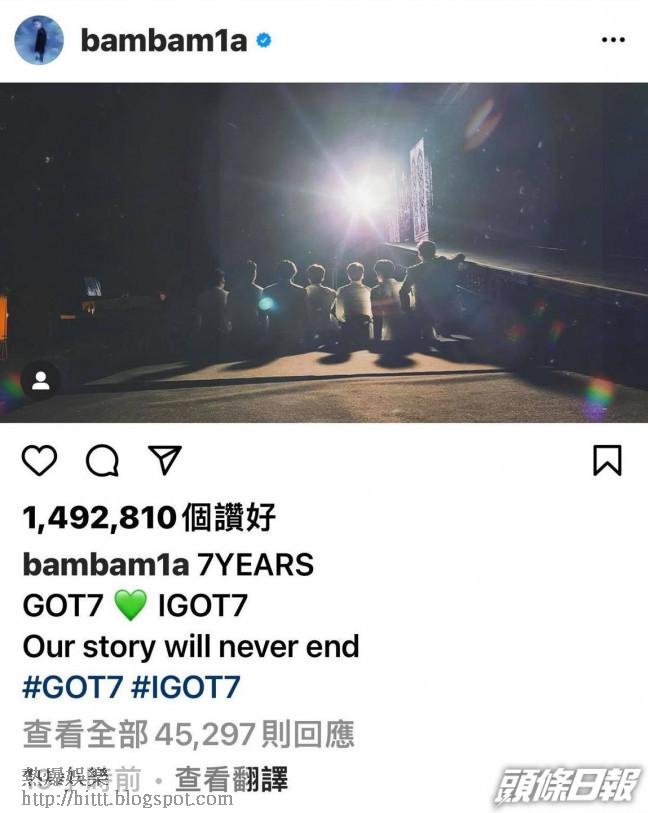 7子各自在ig貼上同一張坐在舞台上的背影照。成員Mark另外在twitter發文,留言:「7年前就遇見了我們的粉絲,很感謝一起度過這段長時間。當中我們一起經歷了傷心、幸福、生氣和愉快的日子,製造了不少美好的回憶,之後也與我們7人一起製造更多的回憶吧!謝謝你們!」