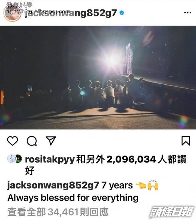 香港成員Jackson(王嘉爾)也在twitter發文,留言:「已經7年,我來了韓國已經有10年的日子,很感謝你們一直看著我的成長,會更加努力,向大家展現我更進步的模樣!」