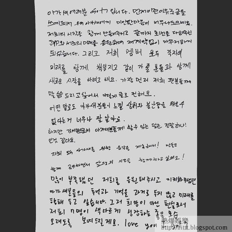 昨日是GOT7在JYP的最後一日,一眾成員都在IG上傳手寫信,表示:「我們非常清楚用甚麼話都無法填補fans們所感受到的傷痛和不安。但作為GOT7,可以對你們說的話只有一個,我們都希望能夠繼續為fans們創作音樂,共享美好的未來。我們不會將此看作是過去,而是將眼光放在未來。」