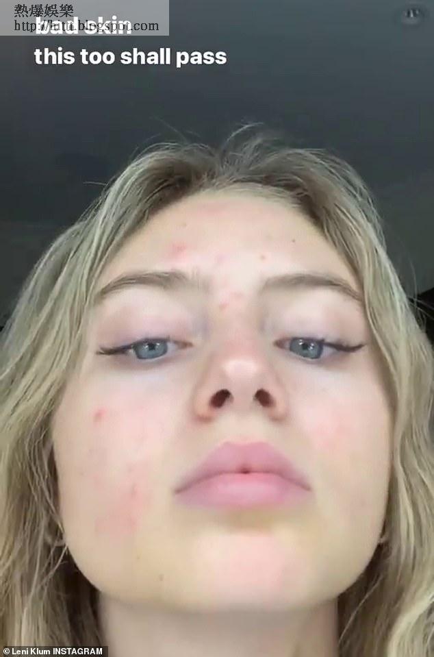 年僅16歲的Leni Klum正值青春期,近日臉上長滿暗瘡,她前日在IG限時動態公開自拍短片,近距離影着額頭和臉上的青春痘,留言表示會消退。Leni還在另一張照片上標籤着「沒化妝」、「沒濾鏡」、「所以怎樣」。Leni自拍現真身,有不少fans留言大讚她夠真實,又指這樣才是正常的皮膚。