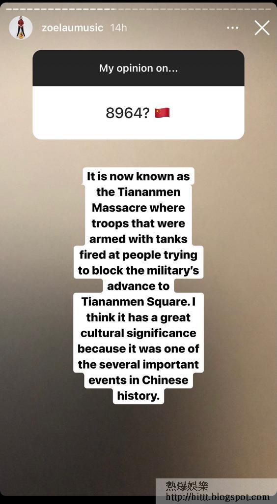 秀盈連月來都有與網民互動玩Q&A答問環節,內容圍繞自己跳舞、讀書等自身問題,昨晚她在IG限時動態分享對不同事件的看法,當中有涉及政治、一夫多妻制、名牌時裝、文學、變性人、男仔跳芭蕾舞等話題,無所不談。其中有一條提及「8964」,即是1989年6月4日的天安門事件,她以英文表示:「It is now known as the Tiananmen Massacre where troops that were fired at people trying to block the military’s advance to Tiananmen Square. I think it has a great cultural significance because it was one of the several important events in Chinese history」,以她的理解64被廣泛認定為天安門大屠殺,向試圖阻止軍隊入廣場的人民射殺,認為這件事有重大的文化意義,亦是中國歷史上的重要事件之一。