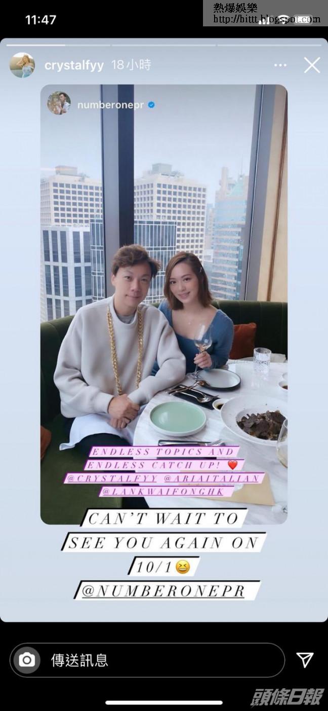有消息指,Martin與氣質長髮女拍拖僅數月,已視對方為終身伴侶,並將於本月30日拉埋天窗。至於頻頻與富豪傳緋聞的馮盈盈,就懶理分手傳聞及舊愛的婚訊,繼續在社交網大晒奢華生活,與公關朋友大擦松露。