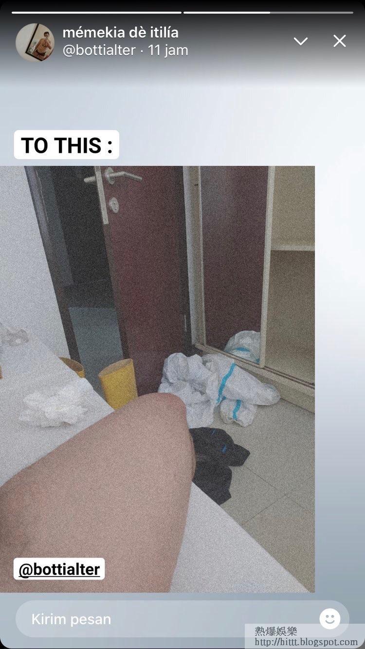 事後男病患還將「完事後」防護衣丟散四處、大汗淋漓的照片,以及兩人的情色對話截圖傳上推特炫耀。(Twitter@bottialter)