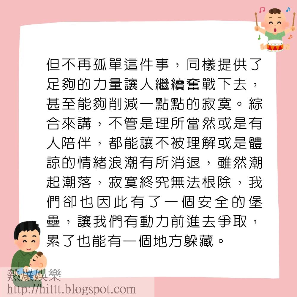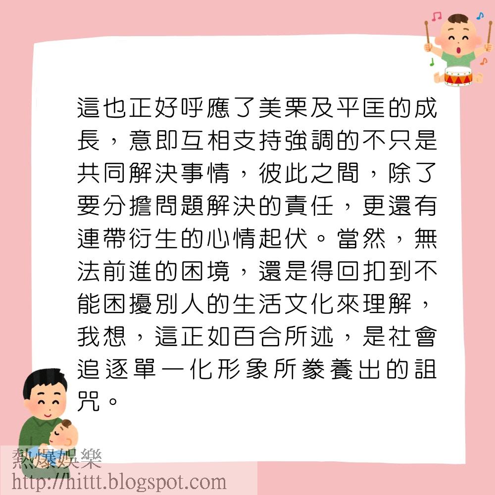 另外,平匡好友們幫助爭取育嬰假的段落,也讓人理解到,即使社會的體制與文化讓人感到寂寞與心涼,理解自己的人依然都在,甚至願意幫忙發聲,為此,即使體制沒有辦法全面或立即的改變,但不再孤單這件事,同樣提供了足夠的力量讓人繼續奮戰下去,甚至能夠削減一點點的寂寞。