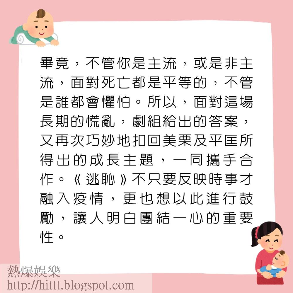 因此,我想《逃避雖可恥但有用》不只要反映時事才融入疫情,更也想以此進行鼓勵,讓人明白團結一心的重要性,藉此,度過危機之後,彼此都能夠學習去堅定地撐起更寬廣的天空。如此這般,本來被主流價值觀給排除在外的邊緣群體,也能在動盪的時代中找到一處可以投放自我的安逸。