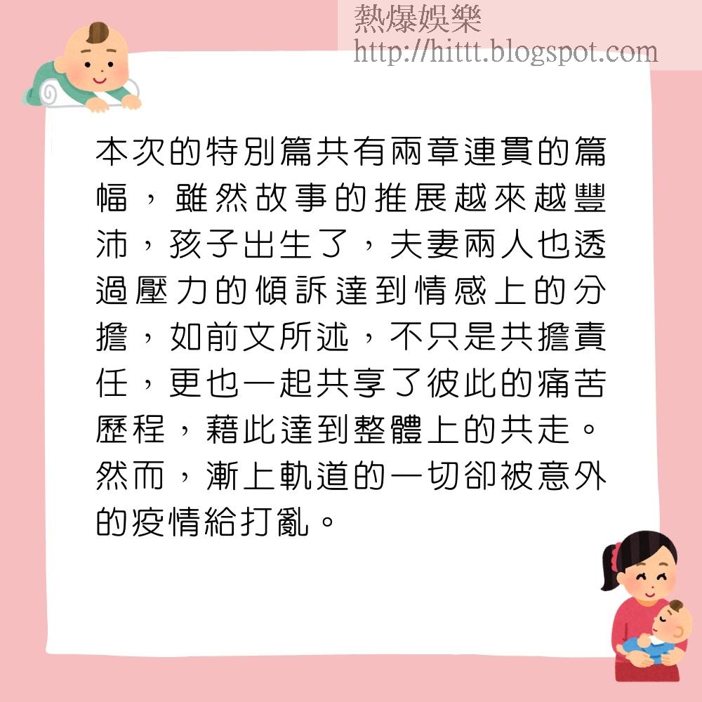 本次的特別篇共有兩章連貫的篇幅,雖然故事的推展越來越豐沛,孩子出生了,夫妻兩人也透過壓力的傾訴達到情感上的分擔,如前文所述,不只是共擔責任,更也一起共享了彼此的痛苦歷程,藉此達到整體上的共走。然而,漸上軌道的一切卻被意外的疫情給打亂。即使如此,劇組的主軸還是沒有偏移,依然是要打破人們的習以為常,只不過結合了時事,利用病毒偷走美栗與平匡的幸福。