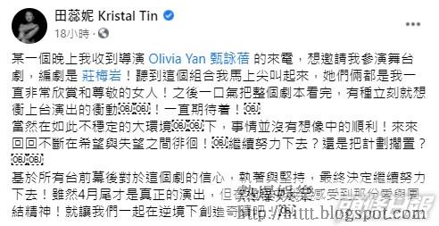 43歲的田蕊妮自去年4月離開無線後,一直未有在幕前演出,專心為老公杜汶澤的網台節目擔任監製。去年11月阿田在社交平台公布將會挑戰演舞台劇,一眾影迷都非常期待阿田再次於幕前亮相。當時她並沒有透露跟誰合作,昨晚她在IG驚喜宣布,即將參演由甄詠蓓執導及莊梅岩編劇的舞台劇。