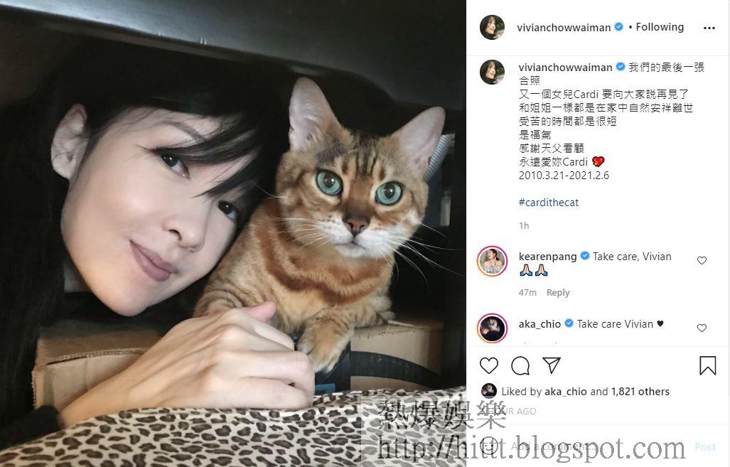 周慧敏今日在IG上載與Cardi一起拍的照片,相中的周慧敏將頭傾向Cardi的身體並露出微笑,而她的手亦搭着愛貓的手仔,感覺溫馨,但可惜的的,周慧儀指這是自已與Cardi最後一張合照,因為Cardi已於今日離世:「又一個女兒Cardi要向大家説再見了,和姐姐一様都是在家中自然安詳離世。受苦的時間都是很短,是福氣,感謝天父看顧。」而趙慧珊、彭秀慧等亦有留叫她保重。