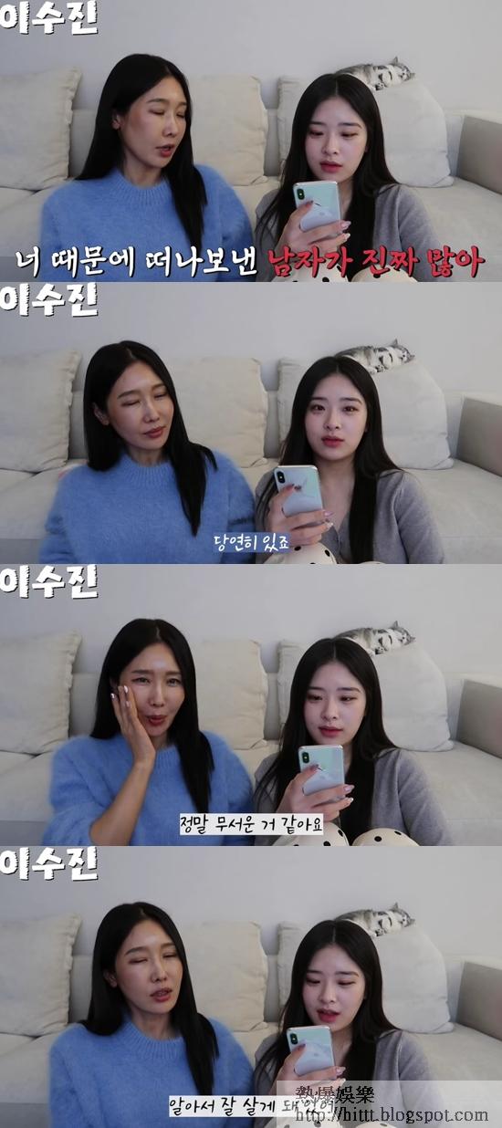 據悉李秀珍之前曾自爆有一個比她年輕27年的男友,她日前在影片中就提到再婚一事,引起網民熱議。影片中李秀珍母女回應網民的留言,被問到兩人有否因為對方的行動或言語而感到傷心,李秀珍坦言因女兒而無法再婚:「因為你(指女兒)而分手的男人真的很多,因為你曾說不想我再婚,又說不想有弟弟或妹妹。」直言想再婚及生小孩。