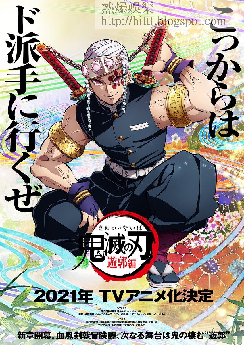 《鬼滅之刃》電視動畫第二季「遊郭篇」繼續由ufotable製作,第一季動畫幕後班底及聲優均攜手回歸,剛公開的宣傳片及海報,以「音柱」宇髓天元作焦點,交代他炭治郎、善逸、伊之助潛入藝伎雲集的「花街」尋找妻子,並展開又一場大戰。