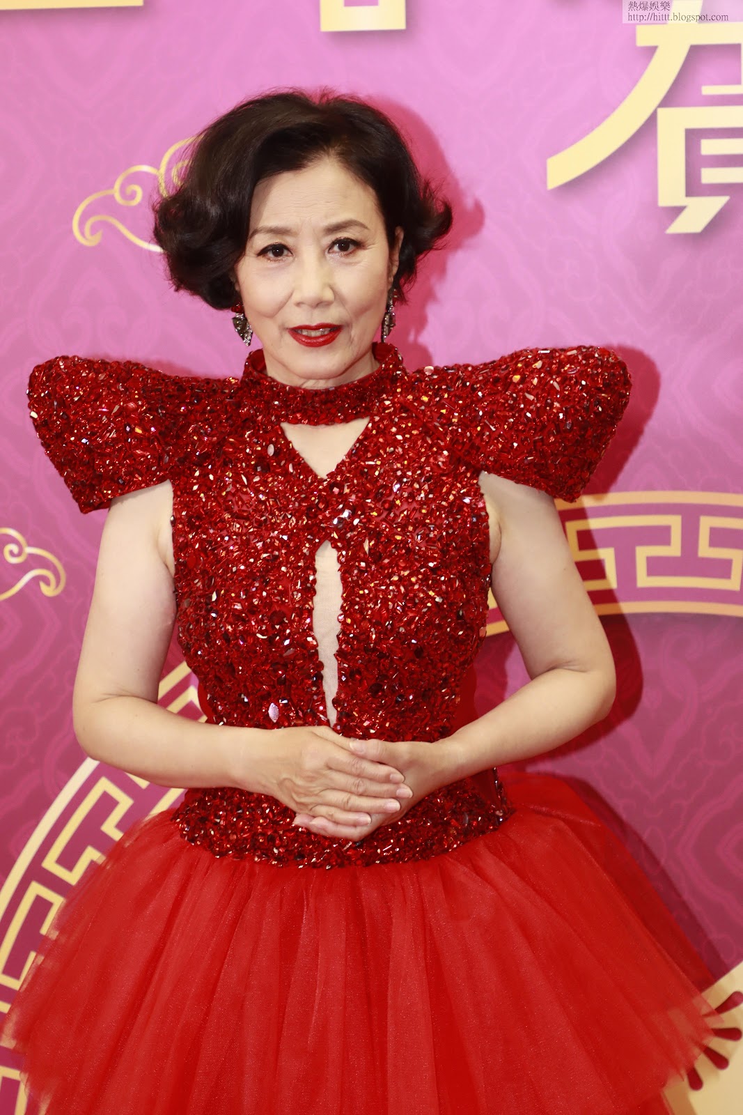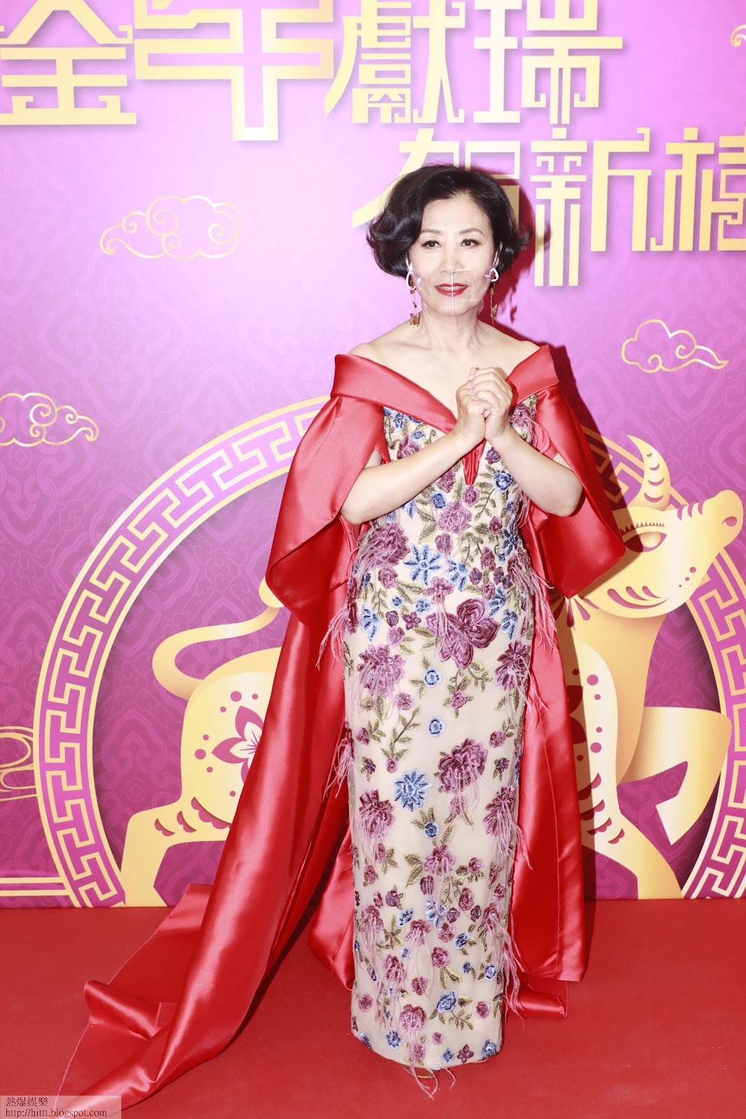每年的大年初一,汪明荃都會為賀年節目擔任司儀,兼獻唱賀年歌曲,今年也不例外。汪阿姐首先着上花卉刺繡晚裝現身,刺繡勾線像「披口」般向外散開,增加立體感,再加上長至及地的紅色緞面披肩,華麗又應節。