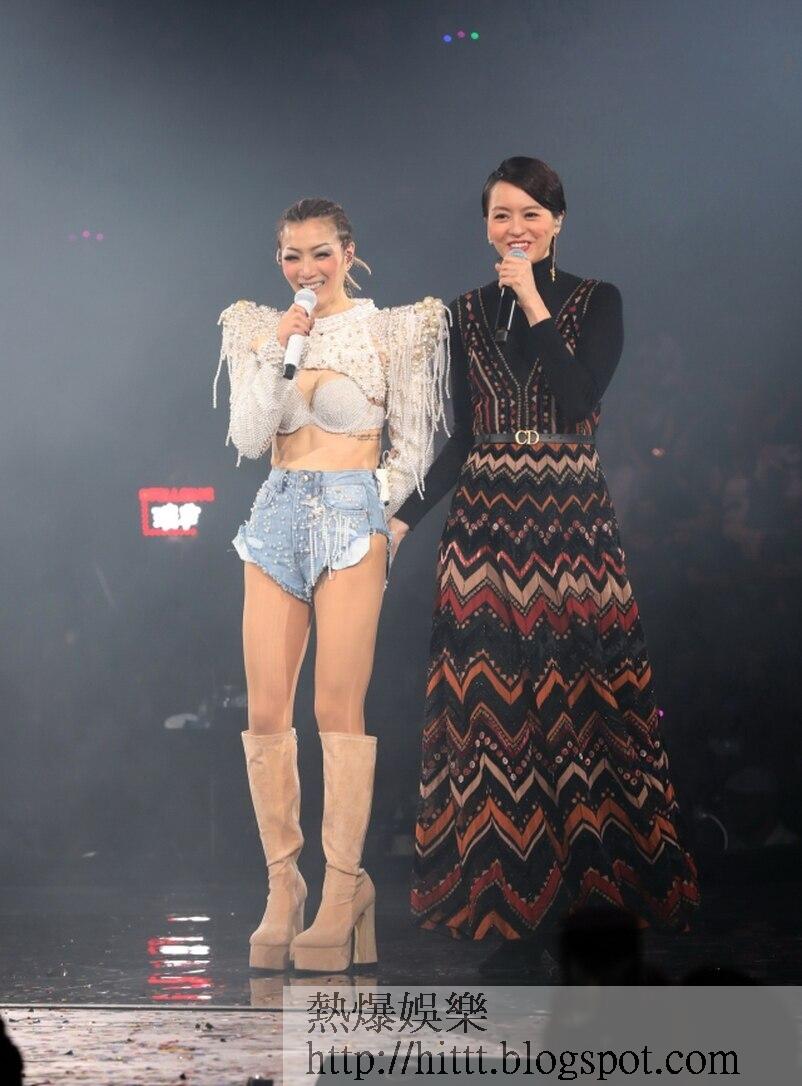 之後阿姐換上另一套紅噹噹的造型騷腿壓軸獻唱《歡樂年年》,禮服上身飾以bling bling珠飾,下身則是有層次感的薄紗蛋糕裙,肩部用上近季大熱向橫伸展兼向上翹的剪裁,非常熟口熟面,鄭秀文(Sammi)在演唱會中也着過類似的設計,原來皆出自本地設計師Tomas Chan之手。不少網民留言大讚造型只有阿姐才駕馭得到,比一般花旦更會穿,薑果然越老越辣。
