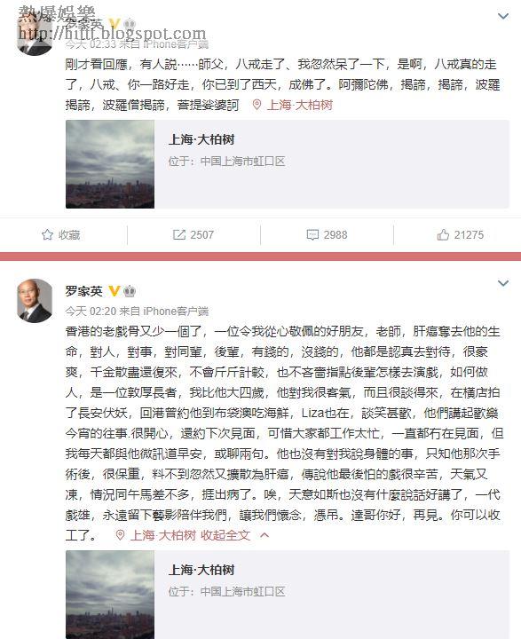 家英哥又提到與達哥聯絡時,對方並沒有向他提起健康問題,只知道達哥手術後變得非常保重身體:「料不到忽然又擴散為肝癌,傳說他最後拍的戲很辛苦,天氣又凍,情況同午馬差不多,捱出病了。唉,天意如斯也沒有甚麼說話好講了,一代戲雄,永遠留下藝影陪伴我們,讓我們懷念,憑吊。達哥你好,再見。你可以收工了。」而當看到網民留言表示「八戒走了」後,家英哥表示自己呆了一下,並留言:「是啊,八戒真的走了,八戒、你一路好走,你已到了西天,成佛了。」
