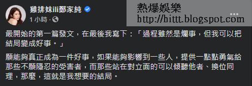 台灣性感女藝人鄭家純(雞排妹)日前控訴出席尾牙活動,遭到老闆、演出歌手性騷擾。事件持續發酵,爆出台語男歌手翁立友是當日的演出者,事後翁立友所屬的豪記唱片公司發聲明澄清。今日雞排妹接受台灣《蘋果新聞網》訪問還原真相,語氣聽來仍心有餘悸。