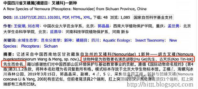 大陸的生態學術期刊《世界生態學》,在最新一擊刊登了一篇文章「中國四川省叉襀屬(襀翅目:叉襀科)一新種」,當中提到在中國西南地區甘孜藏族自治州,發現了叉襀科新品種「胡古叉襀」,文中除提到這種棲息在水邊的昆蟲新品種的命名,是想籍此感謝古天樂及胡歌對中國西部山區環境保護與基礎教育事業的貢獻,故以他的姓氏「胡」及「古」來命名。而一眾網民得知後,均大讚兩人「人帥心善」。
