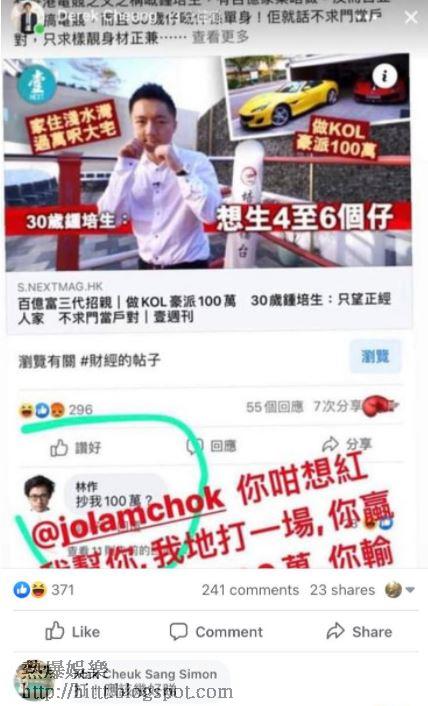 現年29歲的「十優港姐」麥明詩 (Louisa)跟林作在2016年分手,雖然林作媽媽好想二人復合,但仔大仔世界,林作愛上裕美,還在除夕夜於美國猶他州的網上登記註冊結婚。近日林作因為一句抽水說話:「抄我100萬?」辣㷫百億富三代鍾培生,被挑機以100萬打擂台隻揪,就連麥明詩爸爸都在林作的Facebook留言:「打!應該幾好睇。」可惜雙方持續「口水戰」仍未開拖,但已有不少網民開盤買輸贏,還有網民大膽假設:「鍾培生係咪追緊麥明詩,所以想打林作!」