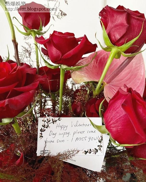 佢唔只收到一紮花,佢以「老公」稱呼嘅圈外人Howie亦越洋送上紅玫瑰,心意卡上寫住「Wifey, please come home soon, I miss you!」以老婆呼喚佢又叫佢快啲返屋企,甜到漏呀!