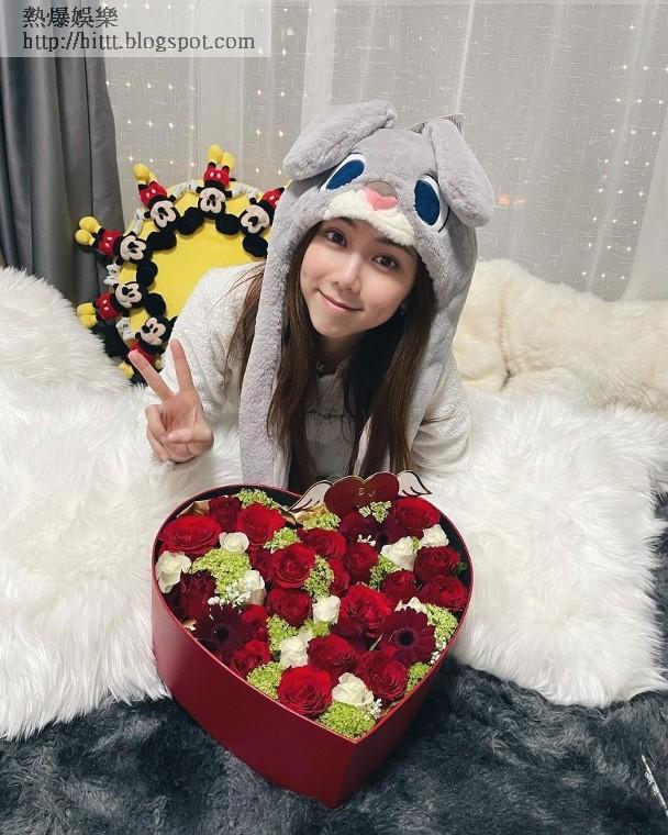 同男友Mark愈愛愈高調嘅G.E.M.(鄧紫棋)就收到一盒玫瑰花,留言:「本來以為今天沒有花,原來我錯了🤣情人節快樂❤️」相中嘅佢戴上公仔頭飾,隔籬左右都係啲毛毛嘢,少女感十足!