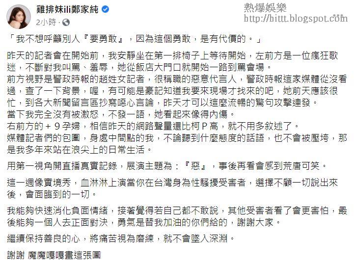 她又指這個星期發生的事,就好像一個實境騷:「血淋淋上演當你在台灣身為性騷擾受害者,選擇不顧一切說出來後,會面臨到的一切。」雞排妹指自己是可以快速去消化負面情緒的人,她表示如果遇到性騷擾後,連自己都不敢說出來,其他受害人就會更害怕:「最後能夠一個人去正面對決,勇氣是替我加油的你們給的,謝謝大家。」而雞排妹最後亦叮囑大家要繼續保持善良的心:「將痛苦視為磨練,就不會墜入深淵。」