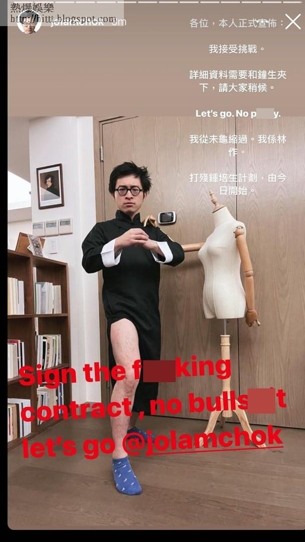 麥明詩舊愛林作辣着「百億富三代」鍾培生,引發一場百萬搏擊擂台賽,鍾培生表明已定好合約,只欠林作動筆,而今日林作亦正式宣布答應出戰,佢喺社交網晒出着上一身唐裝嘅照片,見佢拉開衩位騷出甲組腳,雙手緊握做出「敬禮」姿勢,似乎鬥志旺盛,佢留言:「各位,本人正式宣佈(布):我接受挑戰。詳細資料需要和鍾生夾下,請大家稍候。我從未龜縮過。我係林作。打殘鍾培生計劃,由今日開始。」而鍾培生亦火爆回覆指:「Sign the fxxking contract , no bullsxxt, let's go.(快簽合約,廢話免講。)」