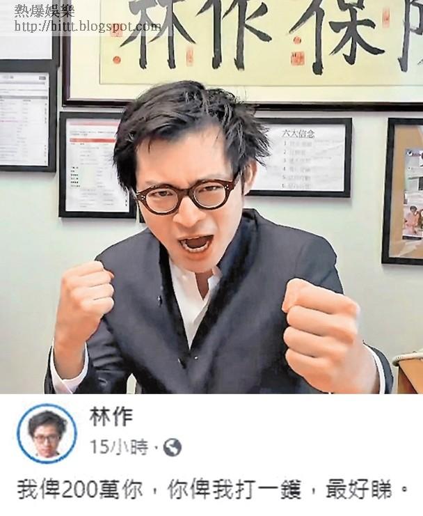 前港姐冠軍麥明詩的舊愛林作,向來愛抽水博出位,近日又衰多口辣火頭,引來百億富三代鍾培生向他開出百萬擂台隻揪戰書,並揚言:「所有香港人都想我揼佢!」由口水戰變拳頭交,明明笠水縮沙的林作,竟然「反價」聲稱可豪擲200萬,叫對方做人肉沙包,死剩把口,輸人唔輸陣!