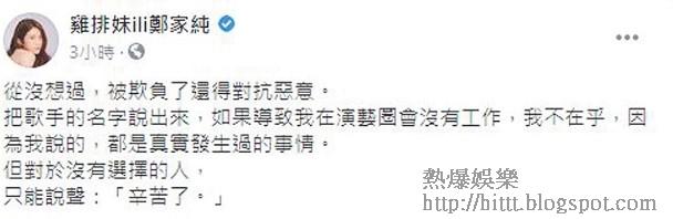 台灣宅男女神「雞排妹」鄭家純日前自爆上月底主持尾禡活動時,慘遭「連環性騷擾」,不但被主辦公司老闆「出口術」兼摸手仔,甚至被某形象良好的男歌手公然摸臀,種種線索指向「台灣金曲歌王」翁立友。事件不斷發酵,她終忍無可忍,怒揭翁立友是「鹹豬手」,並還原事發過程,力數對方3宗惡行,更揚言即使要絕迹演藝圈,也堅持說出真相!
