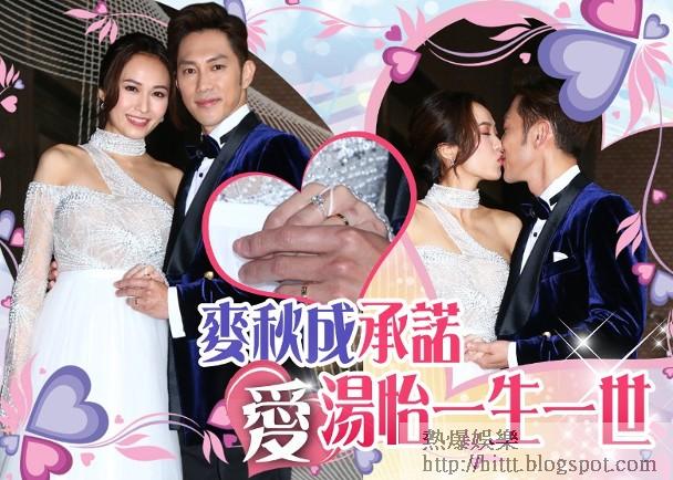 藝人湯怡與麥秋成今日舉行婚禮!下午4時許,一對新人出來接受傳媒訪問,穿上晚裝的湯怡明顯「見肚」,戴上兩卡鑽石婚戒,二人應大家要求多次咀嘴。湯怡今朝穿上低胸婚紗,升Cup的她性感非常,老公麥秋成笑言:「我睇到眼都凸!不過太太鍾意就得」
