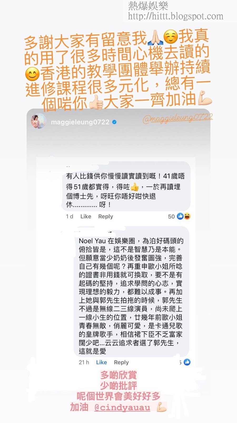 言為Cindy解釋指證書並非金錢可換取,而且Cindy與郭晉安拍拖時,對方只是二三線演員,力證Cindy的努力好學並非一心為泊好碼頭:「願意當少奶奶後發奮圖強,完善自己有幾個呢?重申歐小姐所唸的證書非用錢可換取,要不是有起碼的堅持,追求學問的心志都難以成事。再加上她與郭先生拍拖時,郭先生不過是二三線演員,廿年前歐小姐是卡通兒歌皇牌歌手,相信裙下臣不乏富家闊少。云云追求者選了郭先生,這就是愛。」