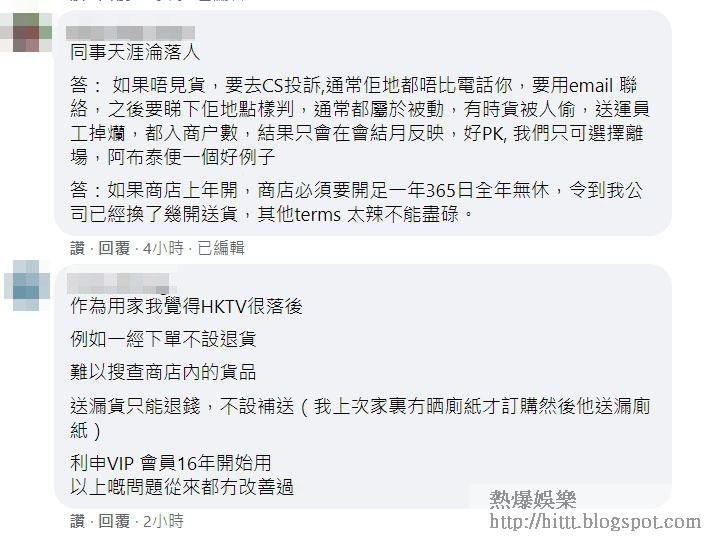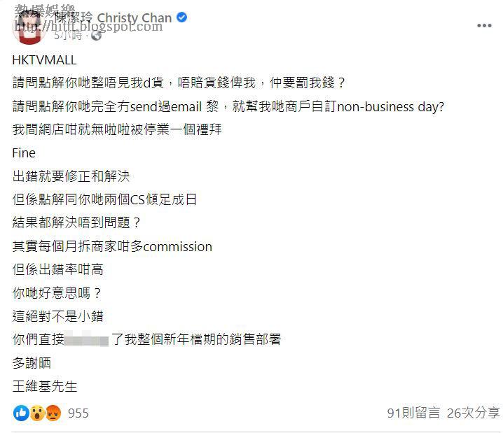 陳潔玲今日在facebook中出post,反問HKTVmall為何整唔見貨唔賠貨錢之餘,更要罰錢?除此之外,她又指對方亦無故將她的網店變為「non-business day」,令她的網店被停業一星期,雖然她有向HKTVmall方面尋求解決方法後亦未能解決問題。「出錯就要修正和解決,但係點解同你哋兩個CS傾足成日,結果都解決唔到問題?其實每個月拆商家咁多commission,但係出錯率咁高,你哋好意思嗎?」而她亦指因對方犯錯,搞砸了她新年檔期的銷售部署,而她最後留言更嘲「多謝晒,王維基先生」。與陳潔玲同是苦主的網民,看完她的post後紛紛留言,有人表示HKTVmall的合約條款話改就改,又有人話給了10萬還要俾錢「買廣告位」等,亦有很多網民直接tag了王維基的FB賬號。