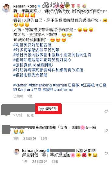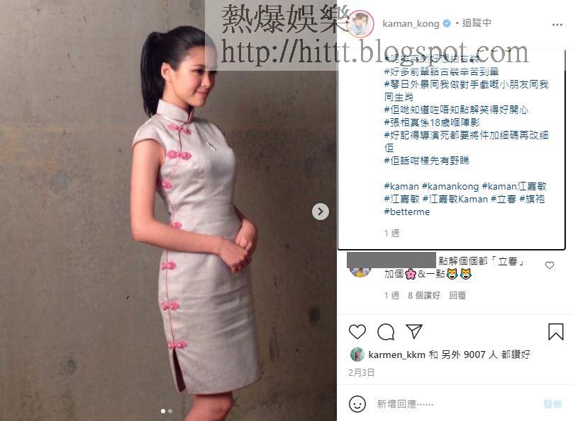 據讀者表示,有網民實測在江嘉敏的IG留言:「fyy靚好多」,結果被江嘉敏秒刪,讀者並提供了一幅留言截圖為證,《蘋果》翻查江嘉敏的IG,發現「fyy靚好多」這句留言的確被消失了。而江嘉敏這個post主題是「立春」,她並貼了18歲那年着旗袍的相片,感慨留言:「看着18歲的自己,忍不住慨嘆時間真的過得好快。太瘦,穿旗袍沒有玲瓏浮得(凸)的感覺。肉太多,更加穿不下旗袍!18歲的時候剛剛好!」
