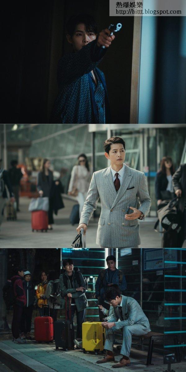 由男神宋仲基主演的tvN劇集《Vincenzo》,將於20日播出,劇組今日再公開多張宋仲基的新劇照。今次公開的劇照是描述宋仲基回韓國的過程,照片中見到宋仲基於漆黑的夜晚,用槍對準某人,表情非常冷酷。另外兩張劇照就見到宋仲基穿上西裝現身機場及巴士站,一路上都表情嚴肅。劇組就預告,宋仲基去到陌生的韓國,將體驗到更加危險的事。